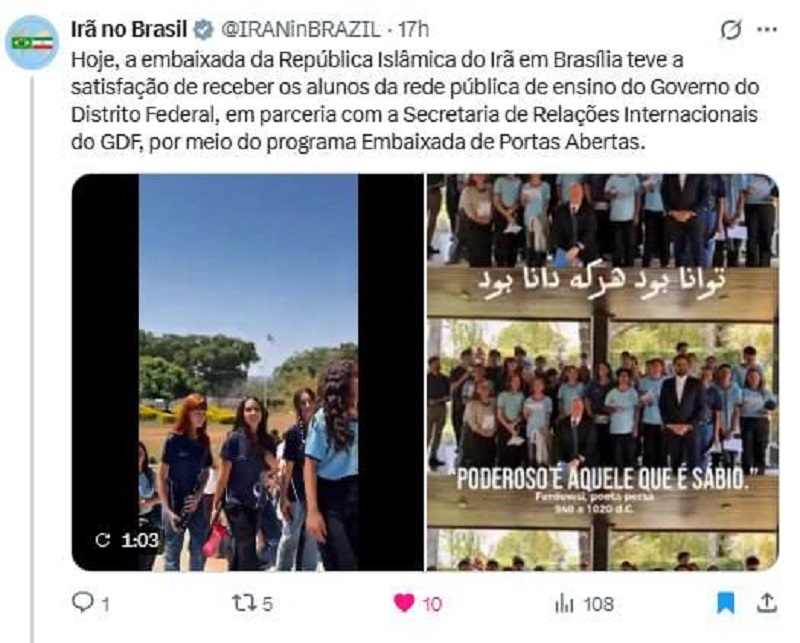 سفارت جمهوری اسلامی ایران در برازیلیا با همکاری دبیرخانه روابط بینالملل دولت منطقهای فدرال، از طریق برنامه سفارت درهای باز، از دانشآموزان سیستم مدارس دولتی دولت منطقهای فدرال استقبال کرد.